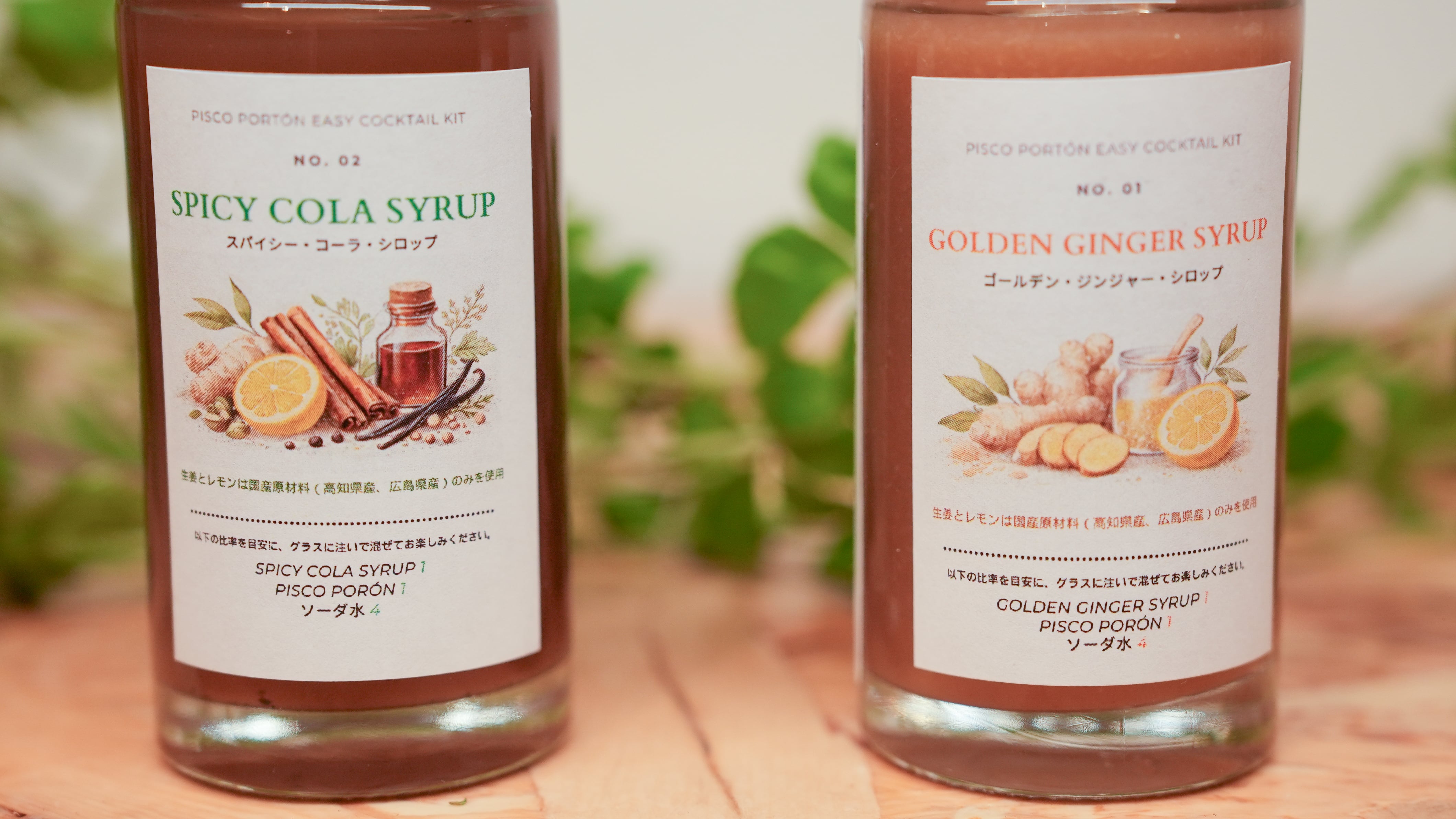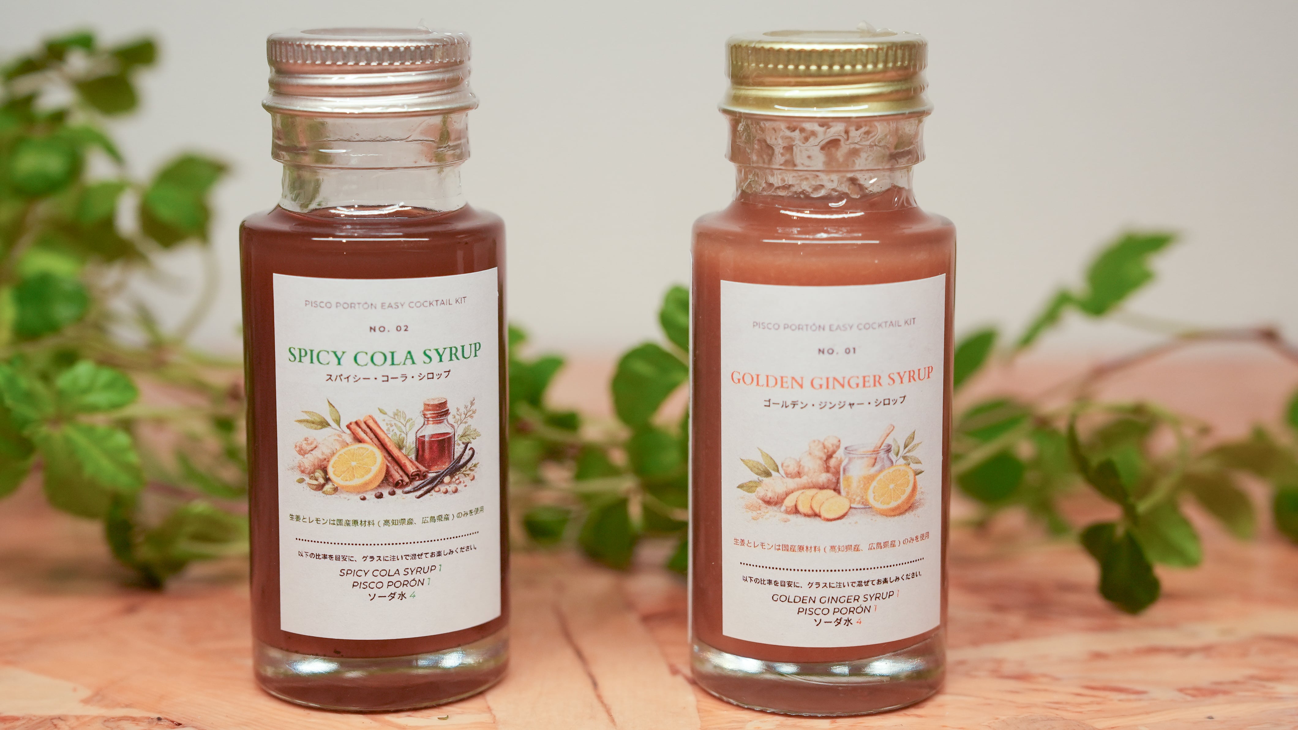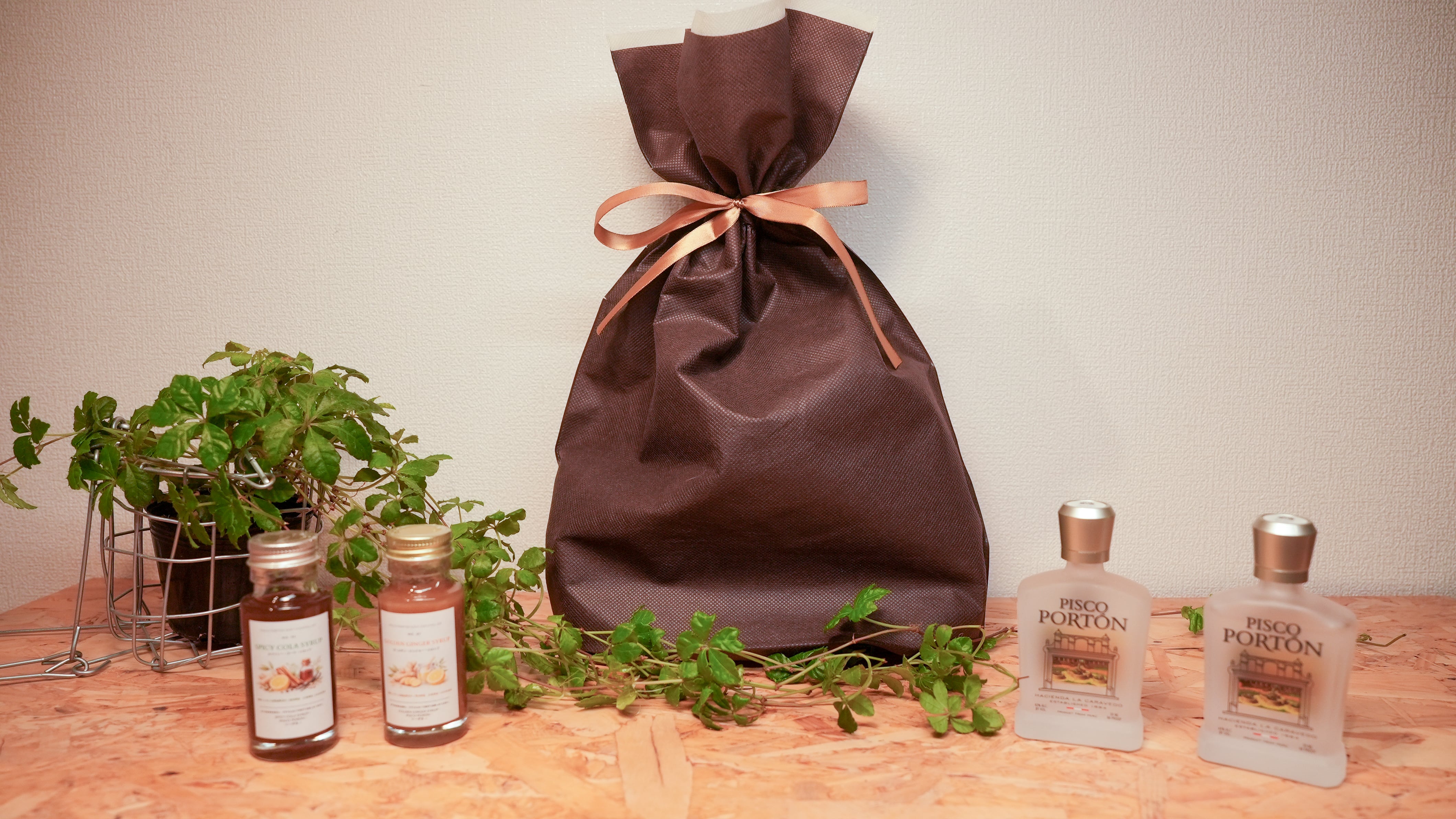 本商品は、ペルー産の蒸留酒 ピスコポルトン ミニボトル(50ml)2本 と、国産素材にこだわった 2種類の特製シロップをギフトバッグにまとめた限定セットです。